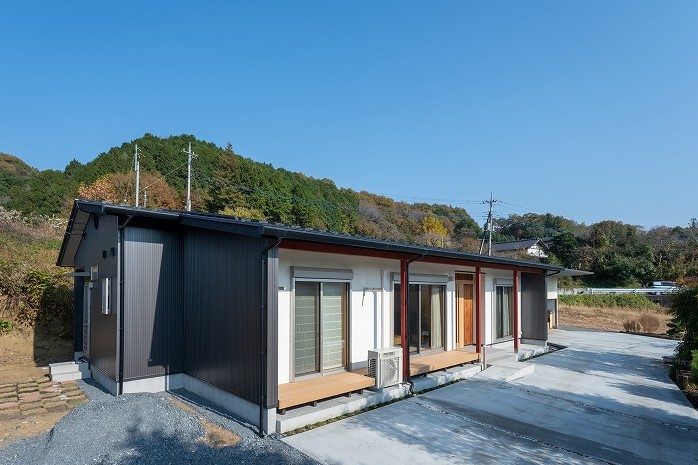 豊かな自然に囲まれた平屋の住まい。ガルバリウムの外壁に柱は赤でワンポイント。城里町は、一年を通して気温が低いので、内装は木のぬくもりが感じられる温かみのある空間としました。キッチンにあるペレットストーブでさらにあたたかく、ゆったりと大きな窓から見える里山の風景は贅沢です。