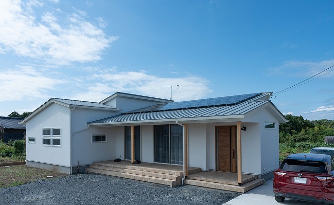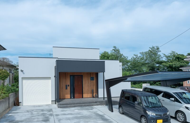 広い土地に建てられた、平屋の住まい。澄んだ青空にも映えるナチュラルモダンな外観。内装は、収納を多く取り入れ、白を基調とした清潔感溢れるものとなりました。リビングと屋外の軒先天井が繋がっていて、それに合わせて土間の高さを調整しました。