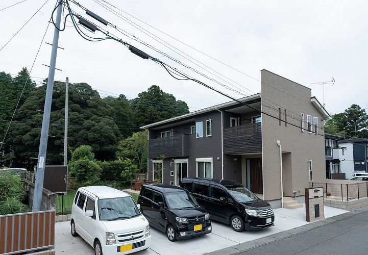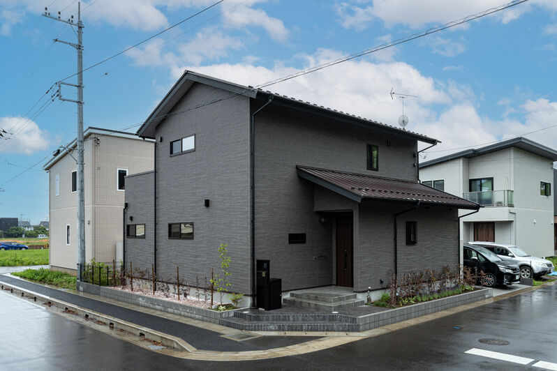 文教地区に建つ、2階建ての住まい。道路側のシンプルな外観と異なり、正面は黒を基調とし、窓枠を白に、バルコニーを木目にして北欧風な印象になりました。ダイニングには、空気清浄機付き照明【cookiray】を採用し、焼肉など煙が出る料理も安心して楽しめます。広い庭は、ドックランになっており、愛犬の存在をいつも感じられます。