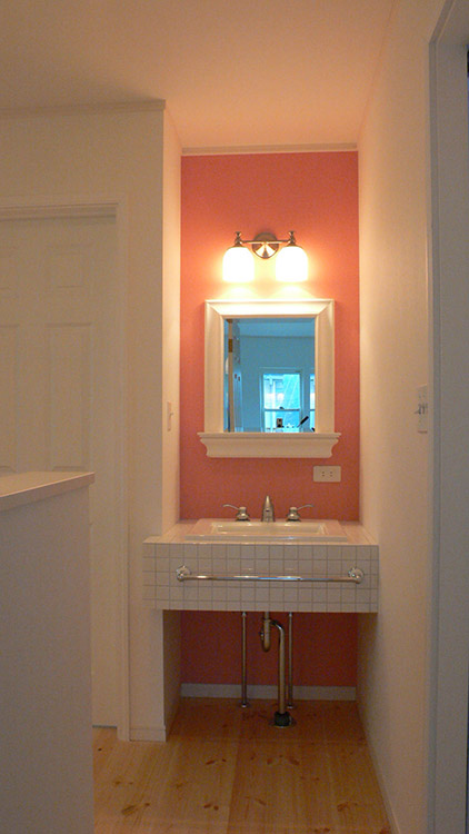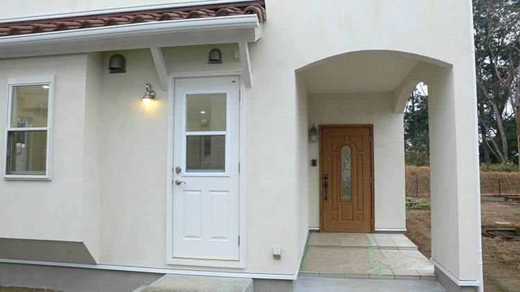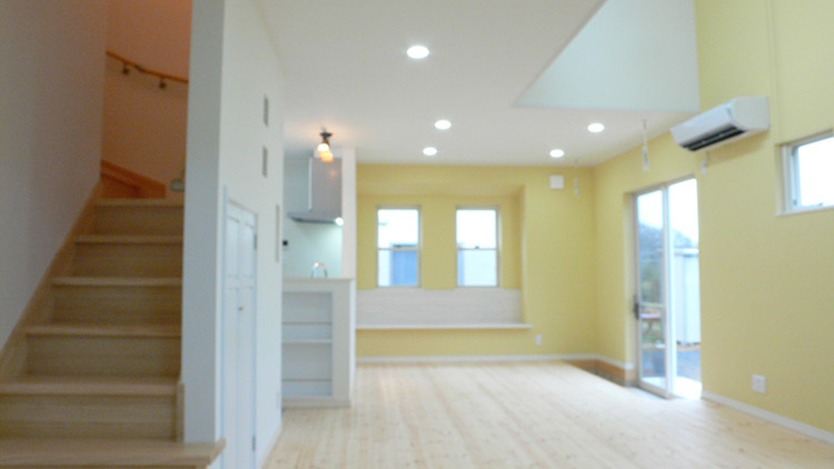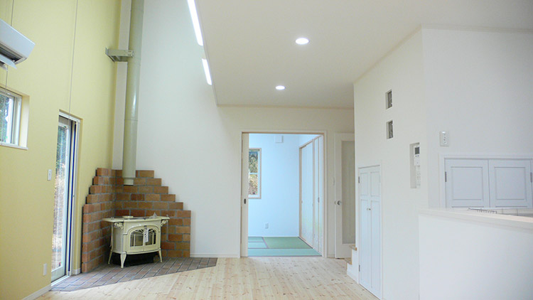 東海村の閑静な住宅街に建つO様邸。淡いイエローのマーブル塗り壁が印象的です。リビングの中心は吹き抜けになっており、お施主様支給の薪ストーブがいい雰囲気を演出してくれます。建材類についても、お施主様自ら個人輸入したものが多数使われており、センスの良さがうかがえます。