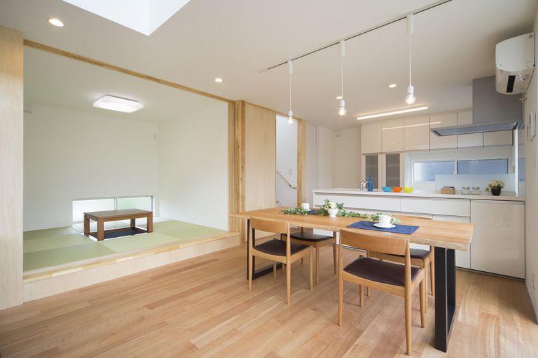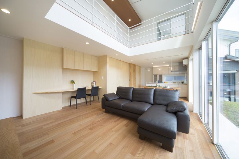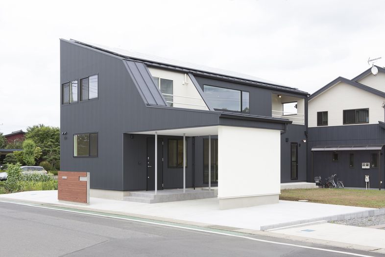 つくば市の郊外に建つI様邸は、建築家一色先生(nidoアーキテクツ)設計事務所の設計監理によるお住まいです。ポーチから張り出した屋根のシルエットが象さんの鼻の形に見える。また、南側の大きな窓へ道路からの視線が気になるので、アイストップとなるよう玄関部分を伸ばす事で、同時に特徴的な立面を作っている。LIXILメンバーズコンテスト2015敢闘賞受賞