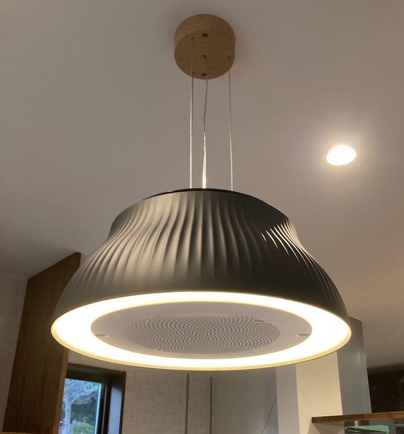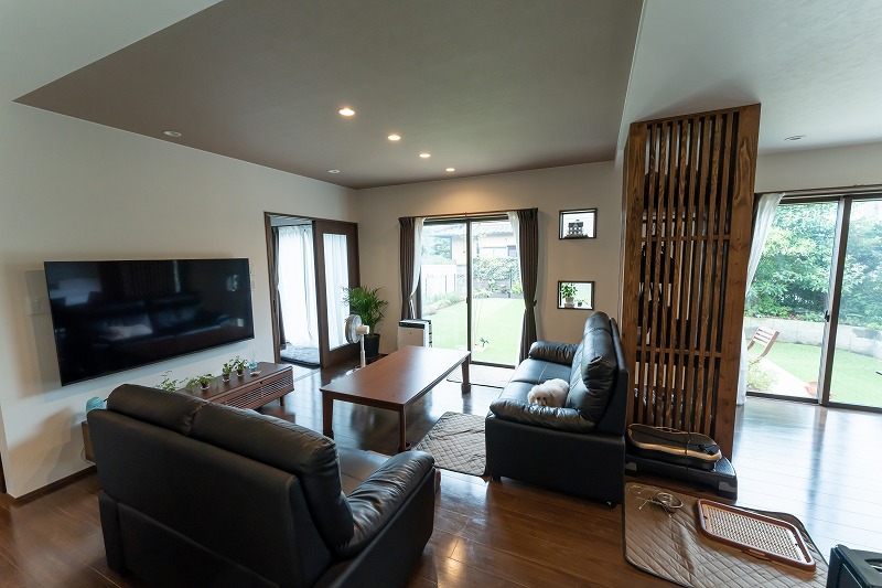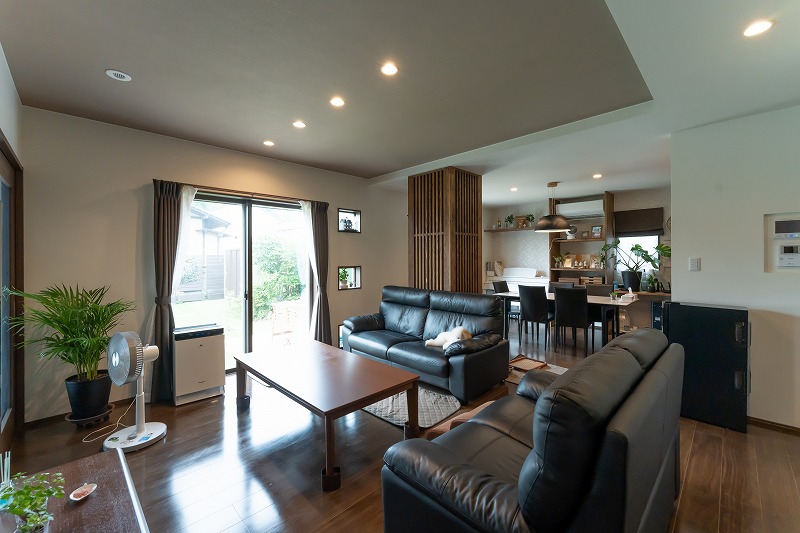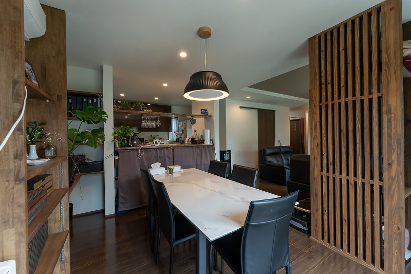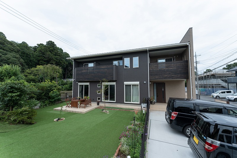 文教地区に建つ、2階建ての住まい。道路側のシンプルな外観と異なり、正面は黒を基調とし、窓枠を白に、バルコニーを木目にして北欧風な印象になりました。ダイニングには、空気清浄機付き照明【cookiray】を採用し、焼肉など煙が出る料理も安心して楽しめます。広い庭は、ドックランになっており、愛犬の存在をいつも感じられます。