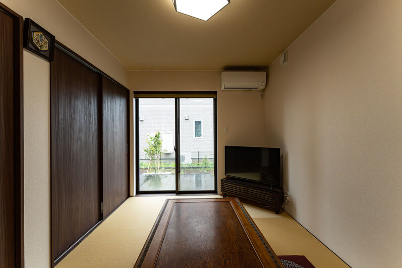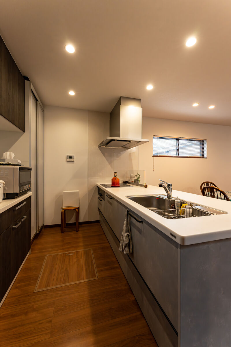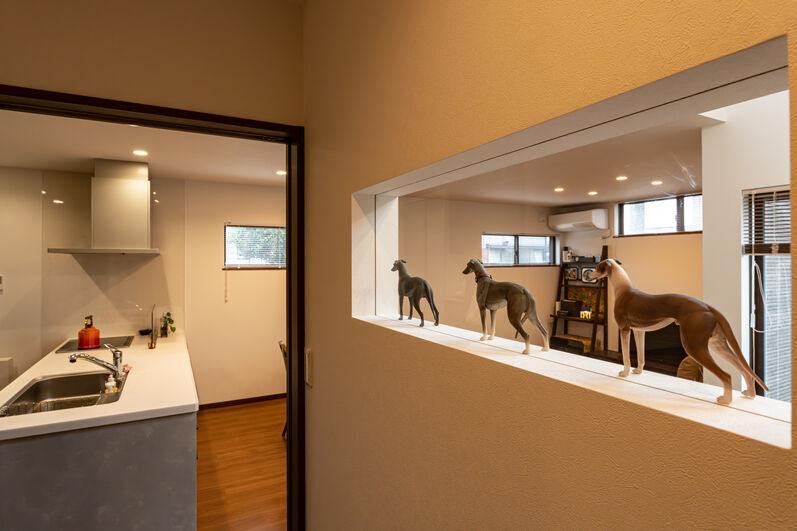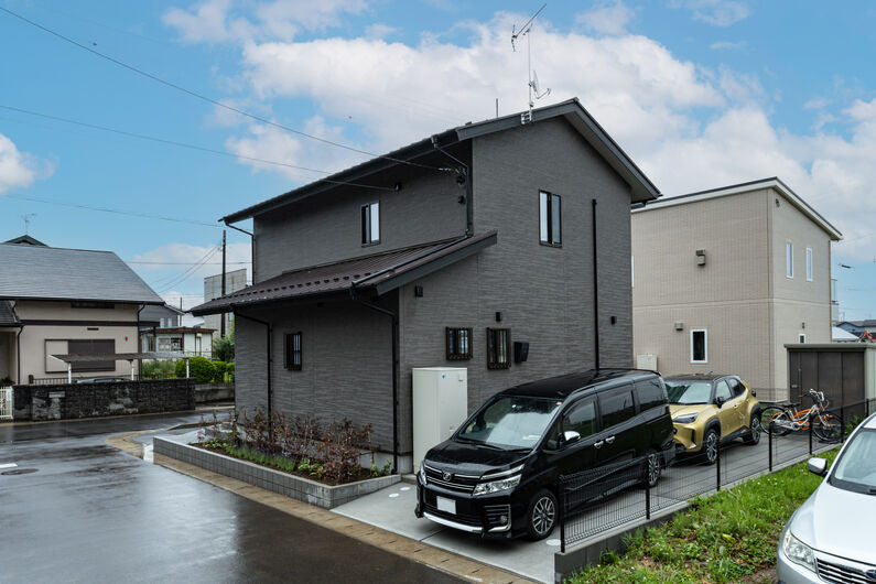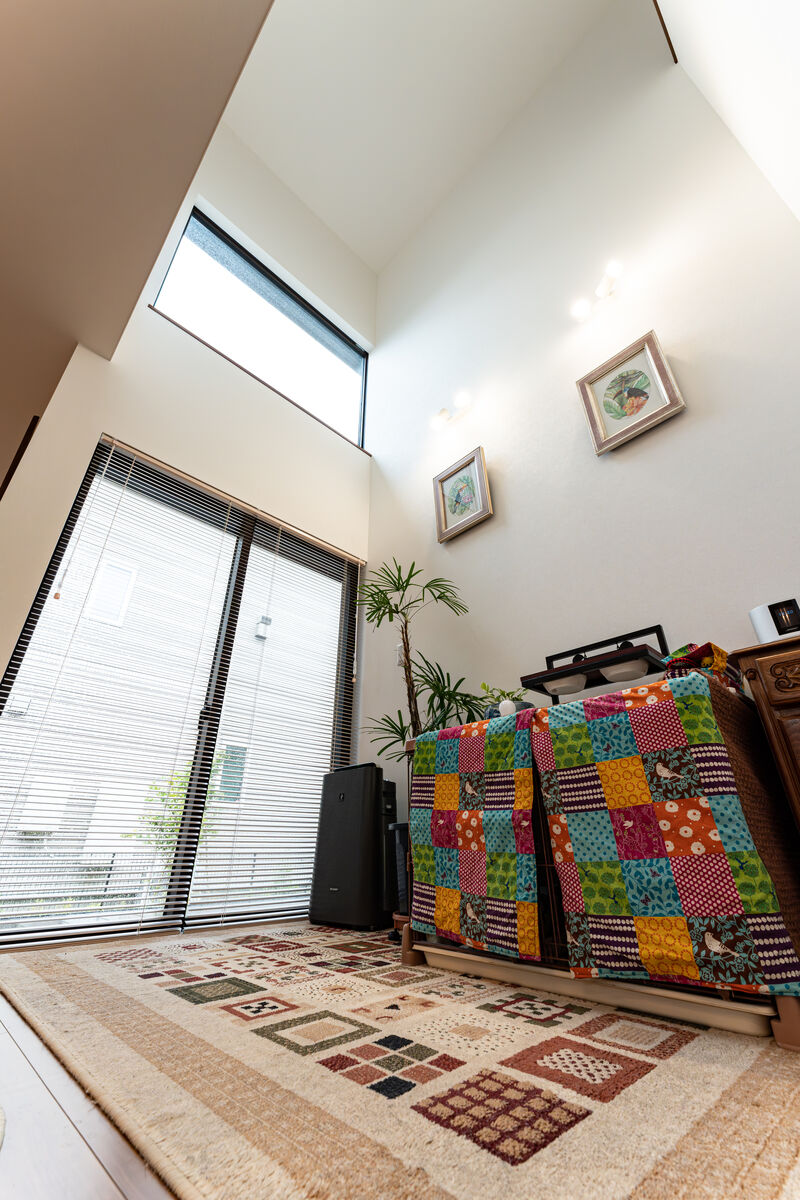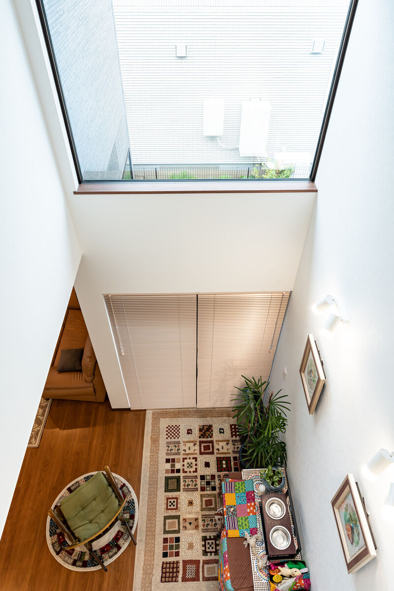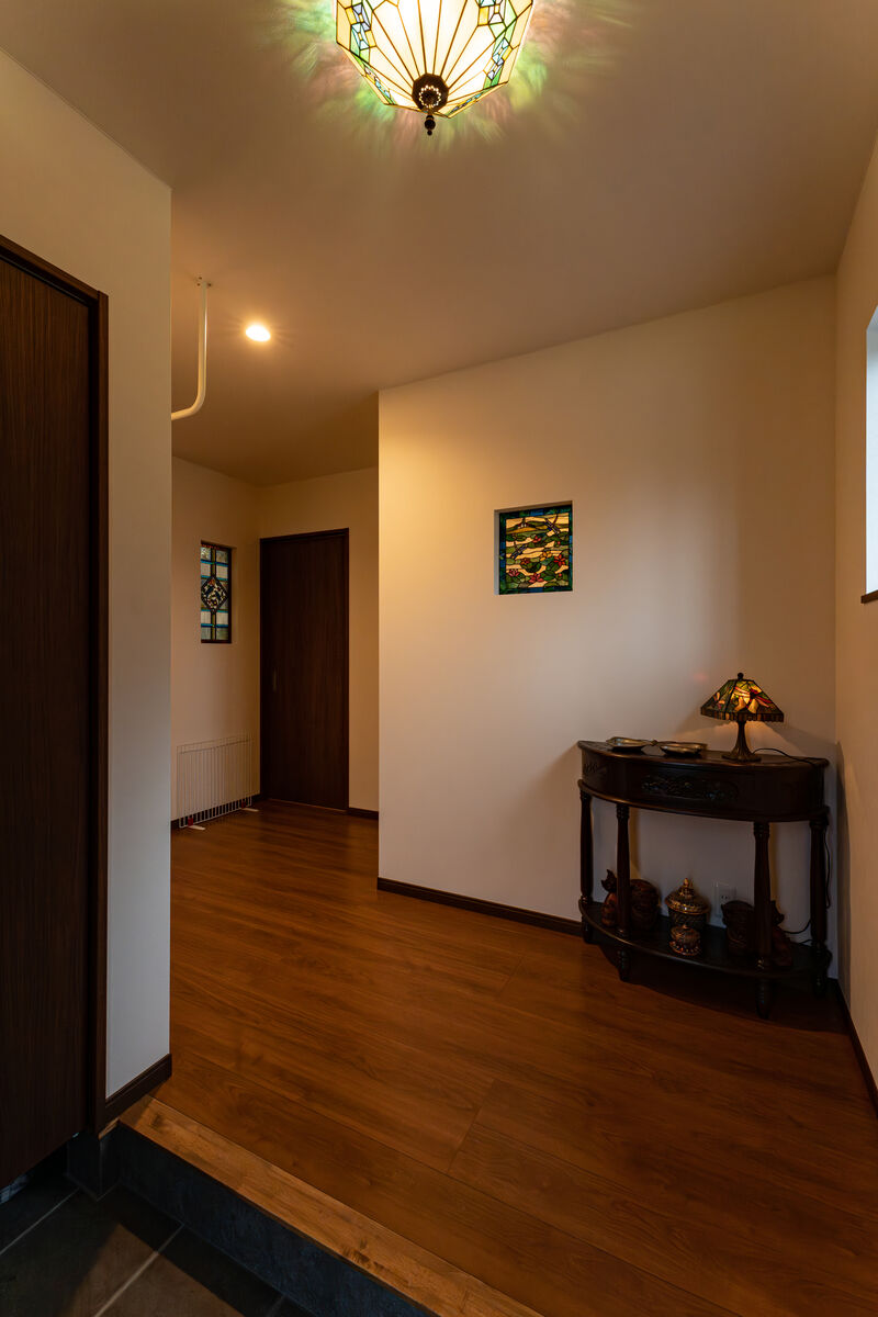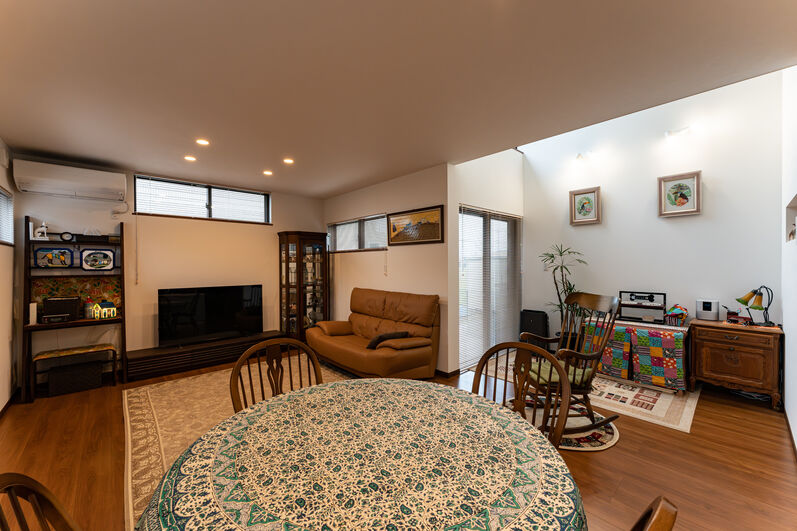 黒い外壁が印象のお住まい。内装は、施主様こだわりのステンドグラスやインテリアを使用。周辺が住宅街なので、窓の高さを調整して日当たりを良くし、道路側の窓は視線を遮るために細長窓としました。吹抜けがある開放的なLDKに愛犬のゲージを配置したりと、一緒に暮らす小さな家族ものびのび過ごせます。