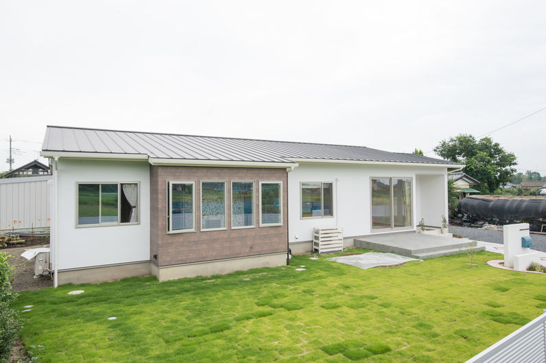 那珂市の郊外に建つ4LDKの住まい。間取りは平屋で、廊下を極力排し、無駄のないコンパクトな配置計画がつかいやすい。また、日中共働きで洗濯物などを室内干しできる便利なサンルームを完備しました
