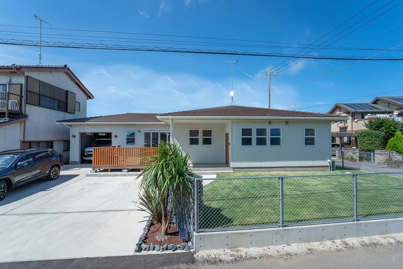 ひたちなか市郊外にあるアメリカンな雰囲気のある平屋の住まい。寄棟屋根の水平ラインが落ち着いた風情。内装材には、飽きてきたら塗り替えのできるペイントクロスを採用し、キッチンにはこだわりのミーレ社製食洗器を装備。そしてお施主様の知人による外構工事が完成し、お洒落でこだわりのあるデザインとなりました。