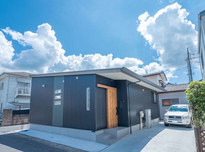 日立市の小高い団地内に建つ、2LDKの平屋の住まい。設計は、NAICA1級建築事務所の湯浅先生が担当されました。ローコストの平屋建て住宅で、ワンルームのLDKと色々な用途に対応できる外土間と中庭をもつ住宅です。