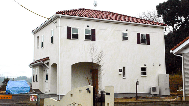 東海村の閑静な住宅街に建つO様邸。淡いイエローのマーブル塗り壁が印象的です。リビングの中心は吹き抜けになっており、お施主様支給の薪ストーブがいい雰囲気を演出してくれます。建材類についても、お施主様自ら個人輸入したものが多数使われており、センスの良さがうかがえます。