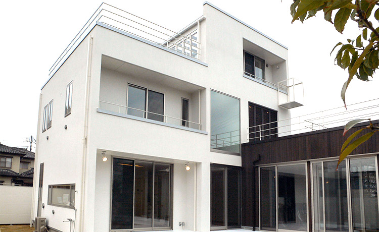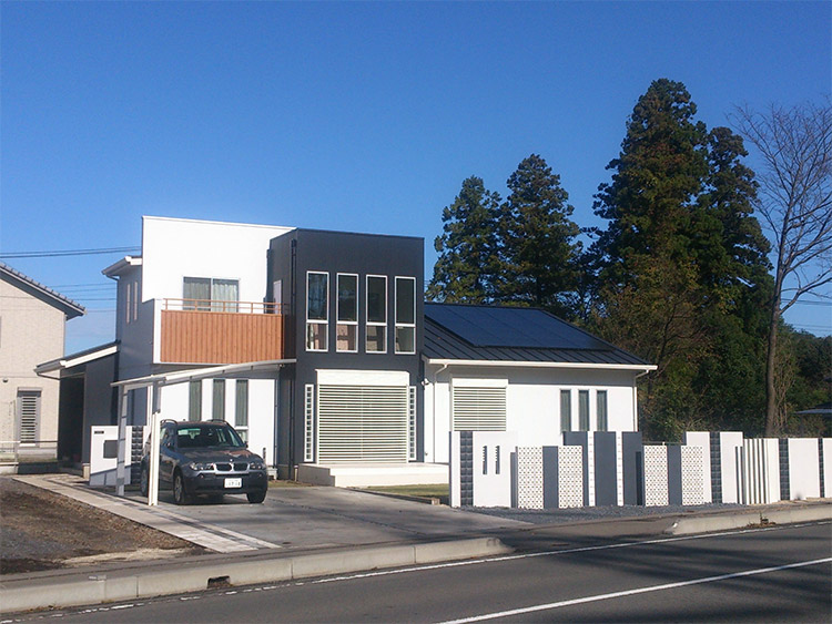 前面道路側から見えるデザインを重視しています。白と黒のコントラストを強調し、バルコニー袖壁は木目のアクセントウォール。室内サンルームは吹き抜けとして、上部キャットウォークから掃除もできます。また、外部窓にパッシブ用の電動スリットシャッターを設け、交通量の多い前面の視線や夏場の暑さ対策は万全です。