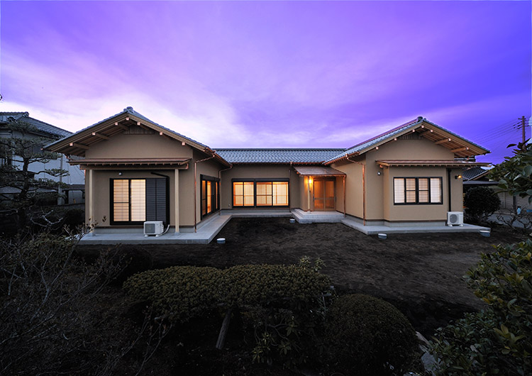 広い敷地を有効に利用したコの字型の平屋の住まい。中央部の中庭はゆっくりと庭園を造る楽しみがあるのだとお施主様。屋根垂木や、内部造作等々数奇屋風に設えた和の家です。