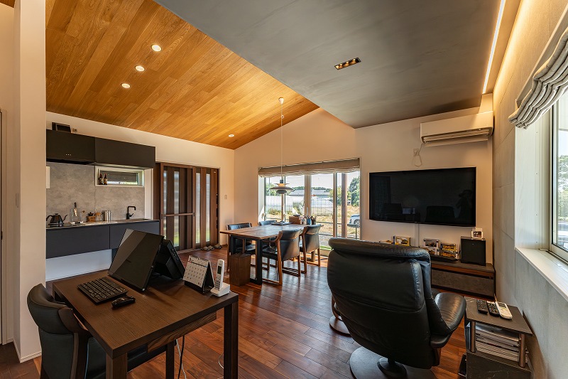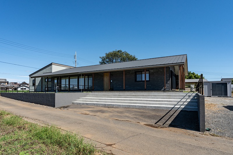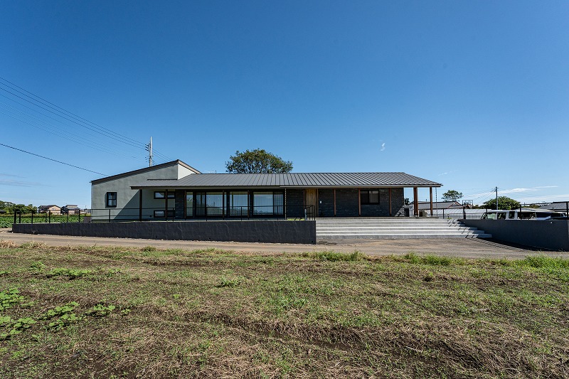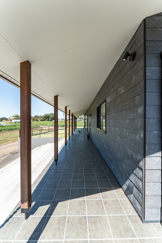 ひたちなか市 O様邸ポーチから続くテラスが印象的な外観のお住まい。リビングダイニングは、勾配天井とサイドの掃き出し窓の採用で、27帖以上の広さに感じる開放的な空間になりました。建築面積:209.38㎡(63.3坪)床面積:157.33㎡(47.6坪)