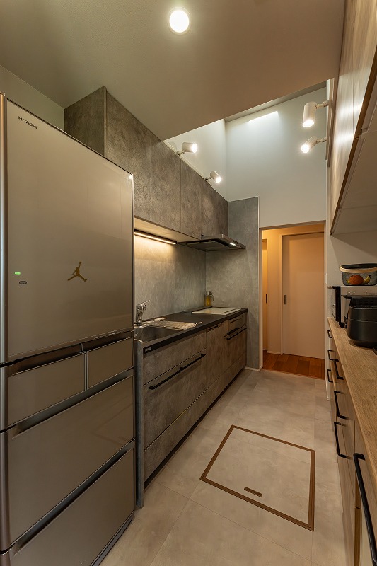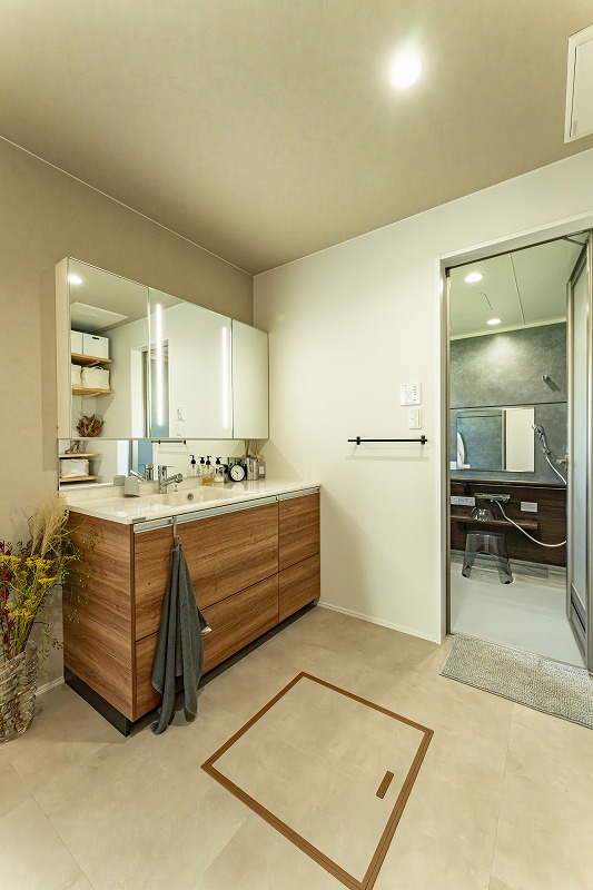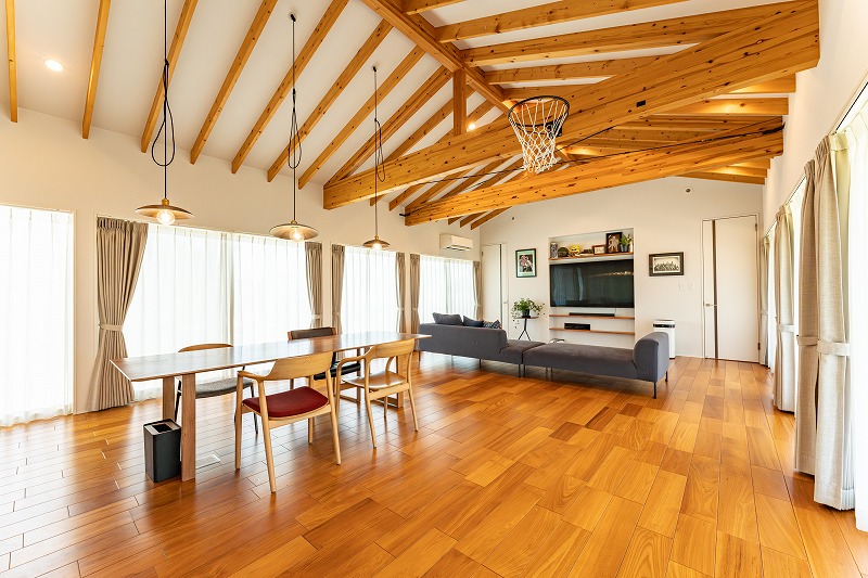 ポーチから続くテラス約27帖のリビングダイニングキッチンを見せない生活感を感じさせない間取り